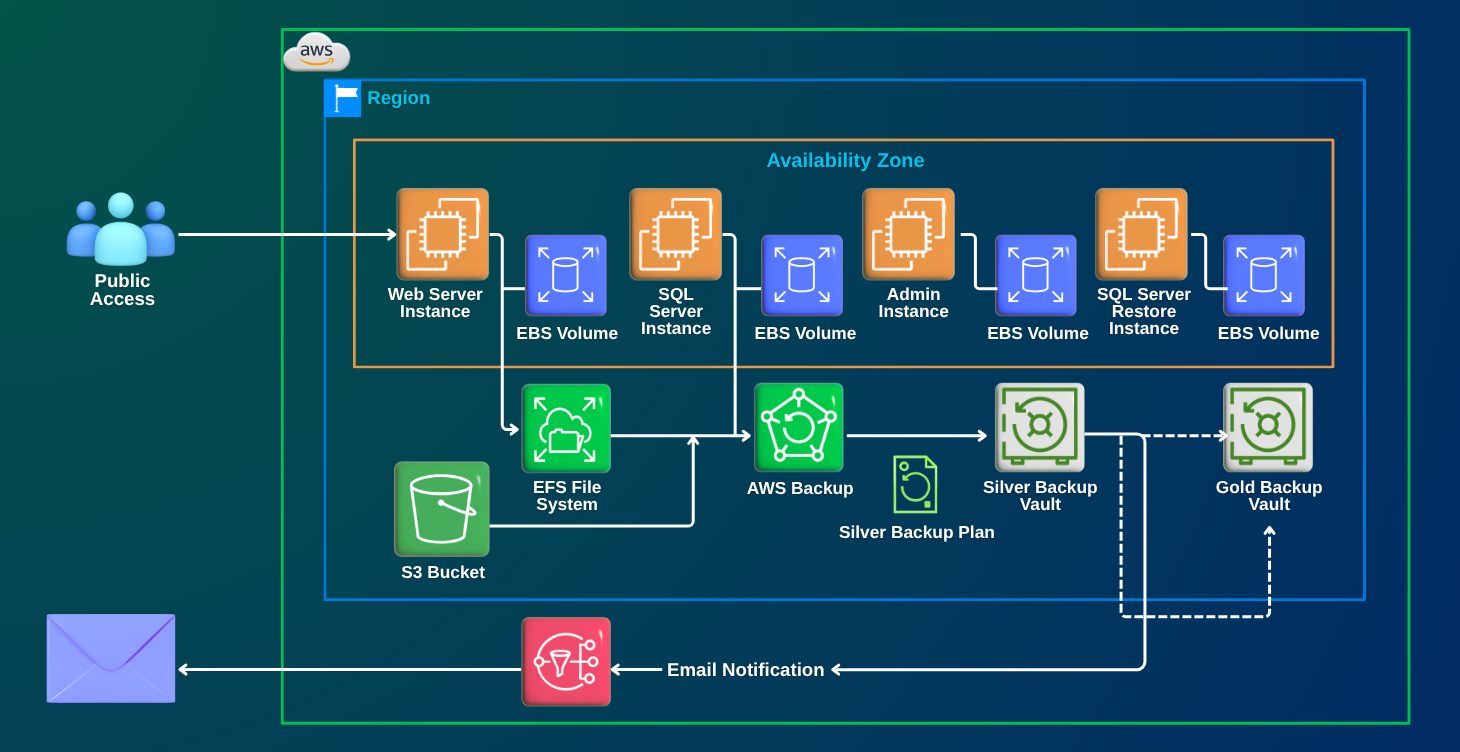 In this Project, you will use AWS Backup to create and manage backup plans for various AWS resources deployed via CloudFormation. Tasks include creating a backup plan to protect EC2 root volumes, performing on-demand backups of EC2, EBS, and EFS resources, and restoring backups. Additionally, the lab covers AWS Backup Audit Manager, where you will create a compliance framework to monitor backup activities, identify and resolve compliance issues, and generate daily compliance reports