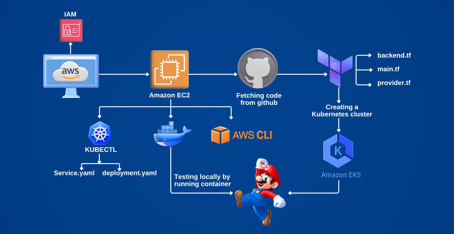 This project focuses on deploying a containerized version of the Super Mario game application on a Kubernetes cluster using Terraform for infrastructure as code. The process includes defining the Kubernetes resources such as pods, services, and deployments in Terraform configuration files. Terraform scripts are used to provision the Kubernetes cluster, and Helm charts may be utilized for managing Kubernetes applications. The goal is to automate the deployment process, ensuring repeatability and consistency across different environments.