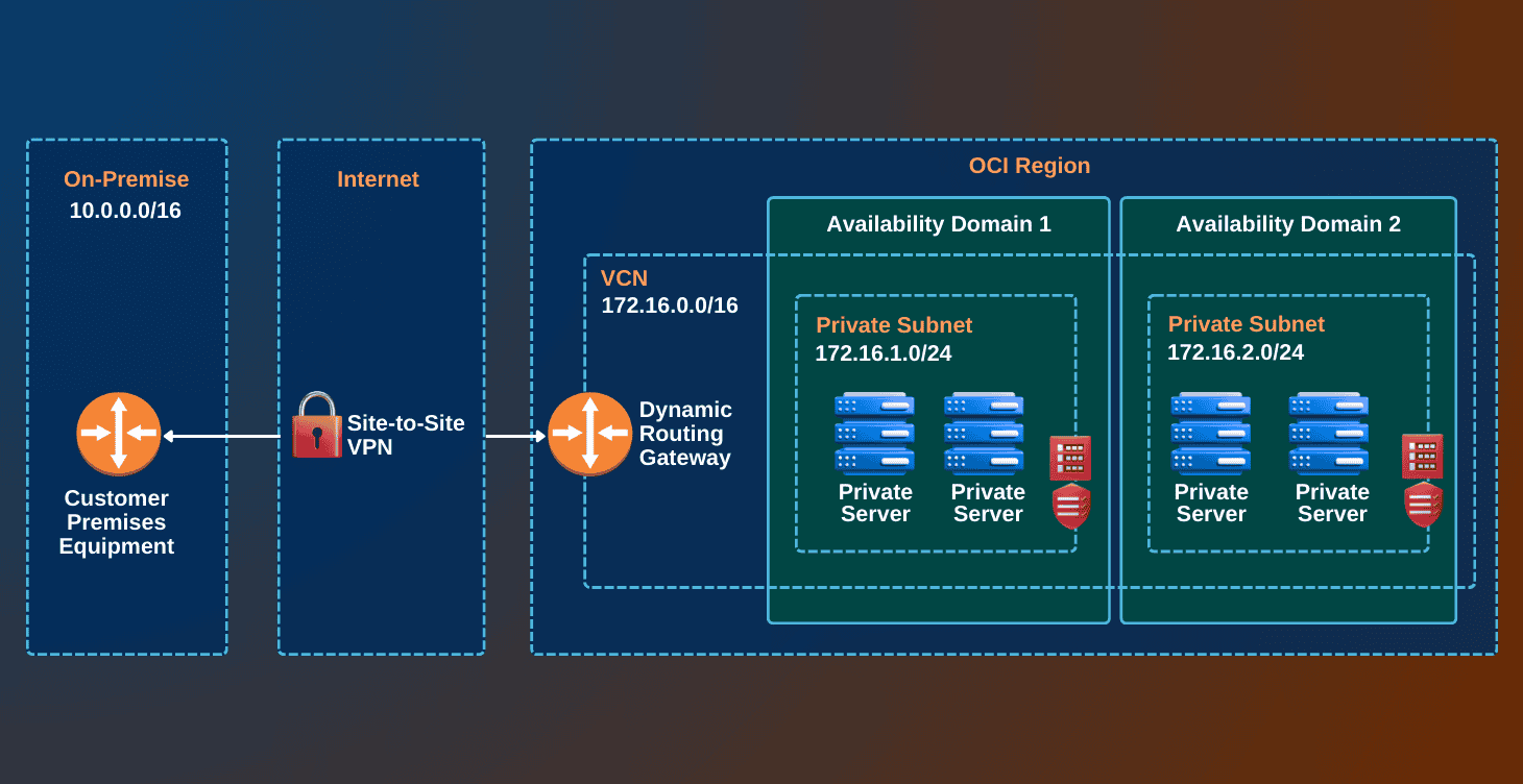 In this project, you will configure a Site-to-Site VPN connection between an on-premises network and Oracle Cloud Infrastructure (OCI). This enables secure communication between the cloud and your private data centers, ensuring seamless hybrid cloud integration.